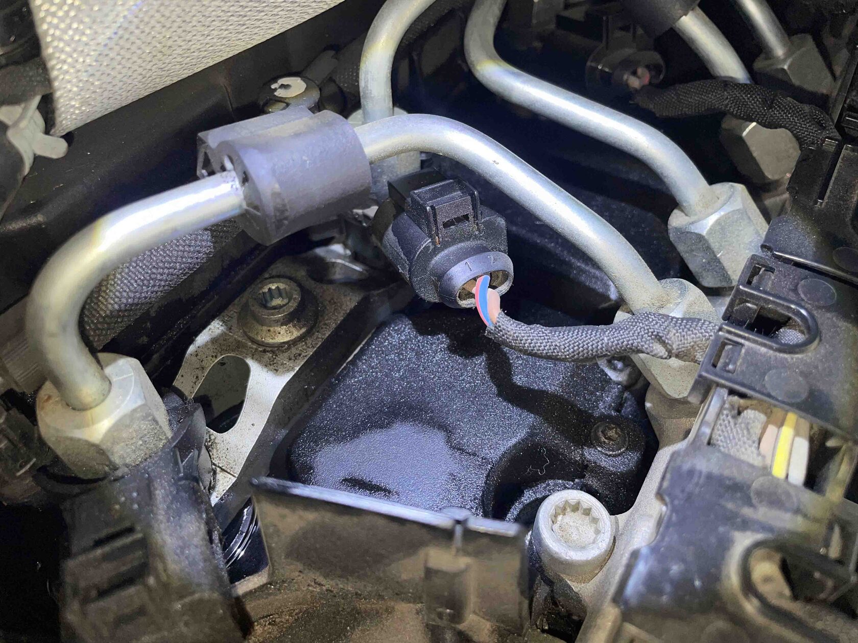 В колодцах полно отработанного дизеля. Там прям лужи. На самом деле это очень опасно. Да, дизельное топливо само по себе не воспламеняется, но все равно, может произойти воспламенение из-за паров и высокой температуры под капотом. Обычно форсунки начинают подтекать на пробеге 150 000 км. и выше. Может быть меняли прокладки форсунок и поменяли криво. Но учитывая сколько там отработки в колодцах, то их меняли или давно, или не меняли вовсе. Ролик натяжения при пуске мотора свистит.